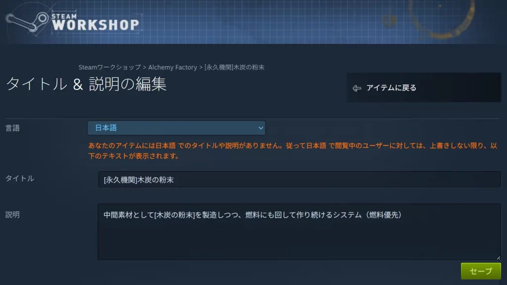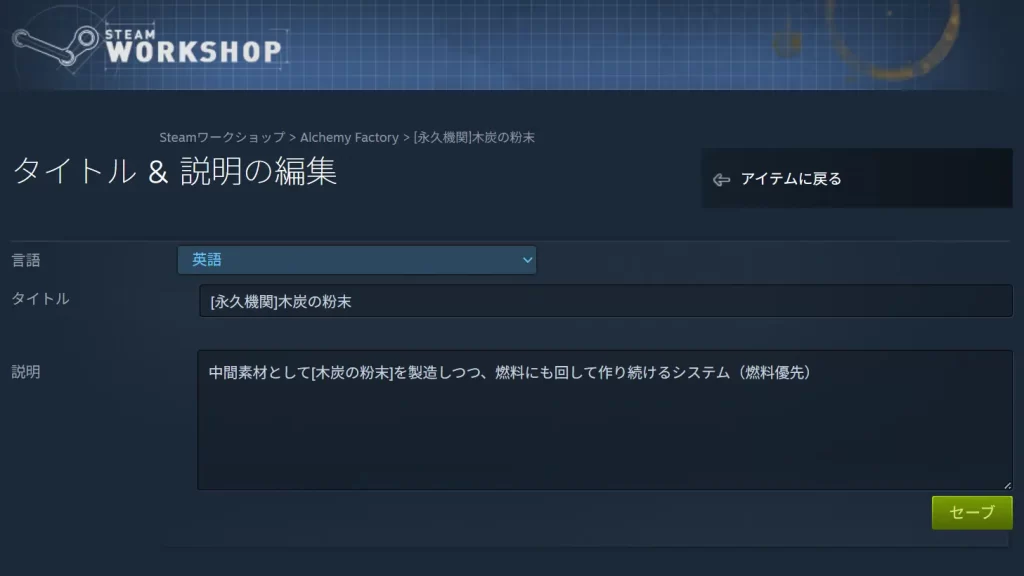 ※ただし、設計図を編集して再アップロードすると、「言語:英語」のタイトルと説明文が設計図にかかれている言語で置き換えられるので、もう一度英語で書き直す必要があります。
