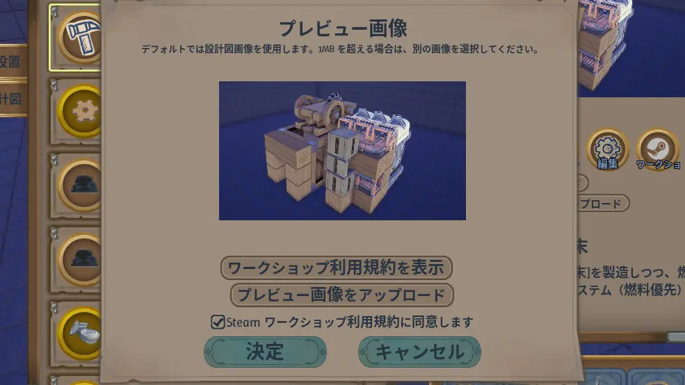 「プレビュー画像をアップロード」で画像を選択できますが、選択し直して作成した設計図が1MBを超えている場合は「アップロード失敗」としてSteamワークショップに登録できません。